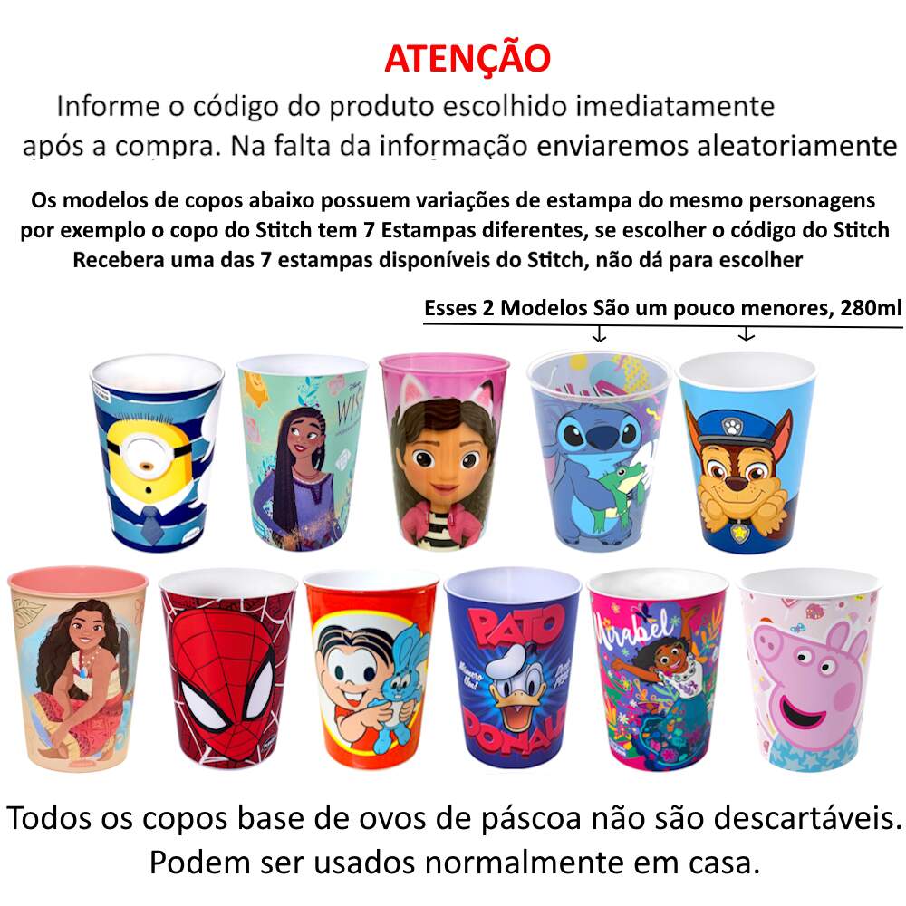 Estes lindos copos, além de decorativos, săo bem construídos com plástico mais rígido de boa qualidade. A estampa dos personagens năo săo adesivos, săo impressas diretamente no copo aumentando a qualidade do produto. Agora seu Ovo de Páscoa sob encomenda agrega valor, incluindo um copo de base que poderá ser utilizado posteriormente pelo cliente com estampa licenciada do personagem favorito da criançada!
