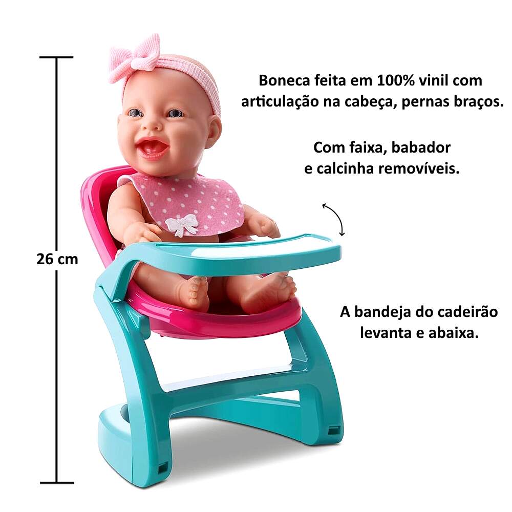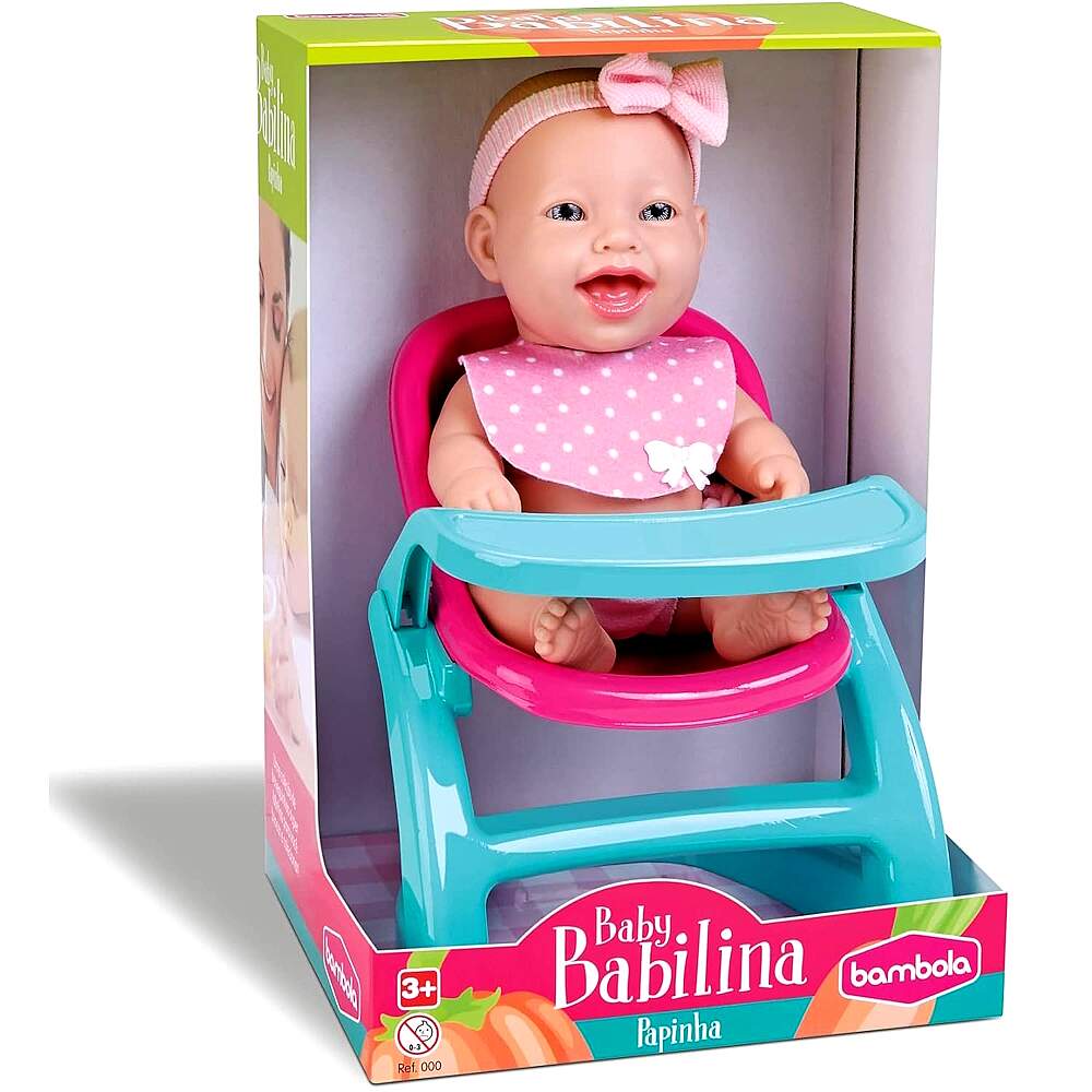 Boneca Bebê Papinha Articulada com Cadeirão para Comidinha na Caixa Bambola Original Boneca Bebê Papinha Articulada com Cadeirão para Comidinha na Caixa Bambola Original 0 avaliações | Dê a sua avaliação! Referência: BAM727 Modelo/Marca: Boneca Bebê no Cadeirão de Comidinha Mini Baby Babilina Papinha/Bambola R$ 45,58 ou 3x de R$ 15,90 sem juros ou em até 9x de R$ 6,34 no cartão Comprar Indicar este produto Deixar um comentário Boleto Bancário Parcelas 1x de R$ 47,69sem juros 2x de R$ 23,84sem juros 3x de R$ 15,90sem juros 4x de R$ 13,28 5x de R$ 10,90 6x de R$ 9,09 7x de R$ 7,95 8x de R$ 6,96 9x de R$ 6,34 Boneca Bebê no Cadeirão de Comidinha Mini Baby Babilina PapinhaA boneca Mini Baby Babilina Papinha da Bambola é um brinquedo fofo e divertido para crianças de todas as idades. É feita de materiais de alta qualidade, segura e cheia de detalhes para brincar. Com a boneca sentada no cadeirão possui 26 cm de altura. Conta com faixa na cabeça, babador e calcinha removíveis. É fabricada em 100% vinil, que dá maciez e uma textura agradável ao brinquedo. Faz parte de uma coleção de bonecas super fofinhas, cada uma com um tema diferente, para você amar e cuidar com muito carinho!Característica:Marca: BambolaModelo: Mini Baby Babilina PapinhaReferência: 727Tamanho (aprox. boneca no cadeirão): 15 x 10 x 26 cm (C x L x A)Idade Recomendada: A partir de 3 anosMaterial da boneca: 100% VinilMaterial do cadeirão: PolipropilenoCertificado INMETRO: Compulsório 009289/2022Conteúdo da Embalagem:1x Boneca Mini Baby Babilina Papinha1x Cadeirão