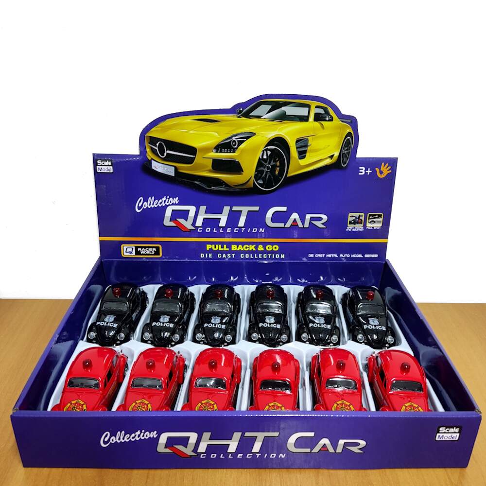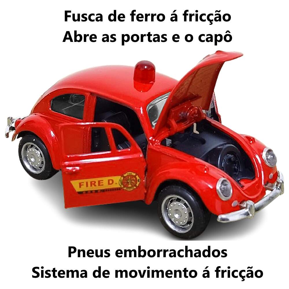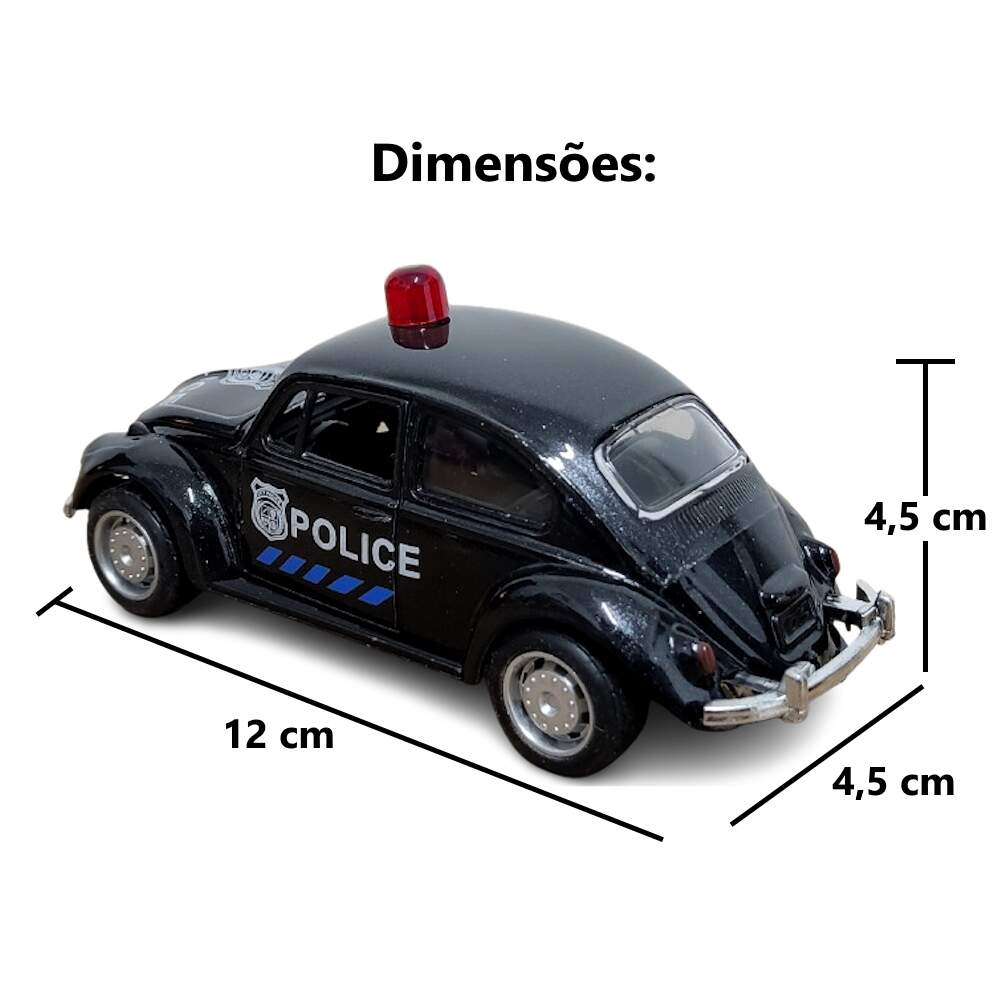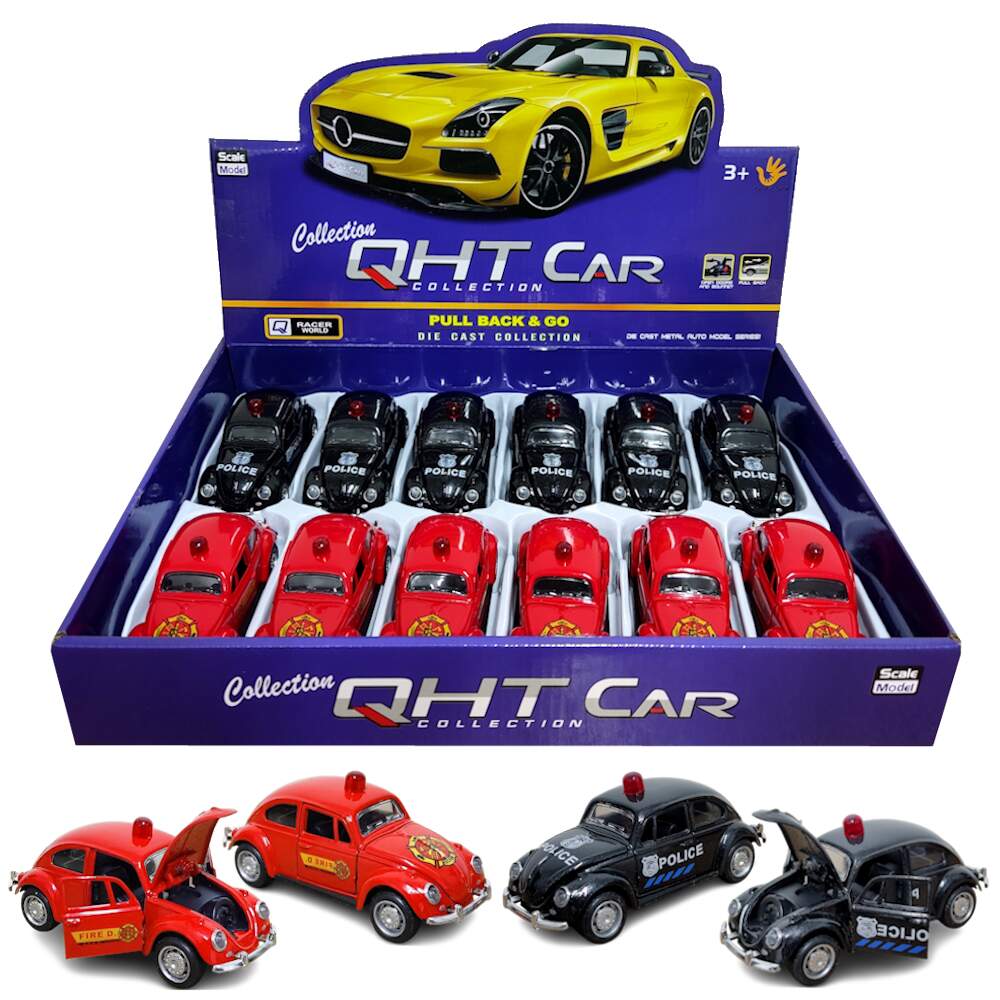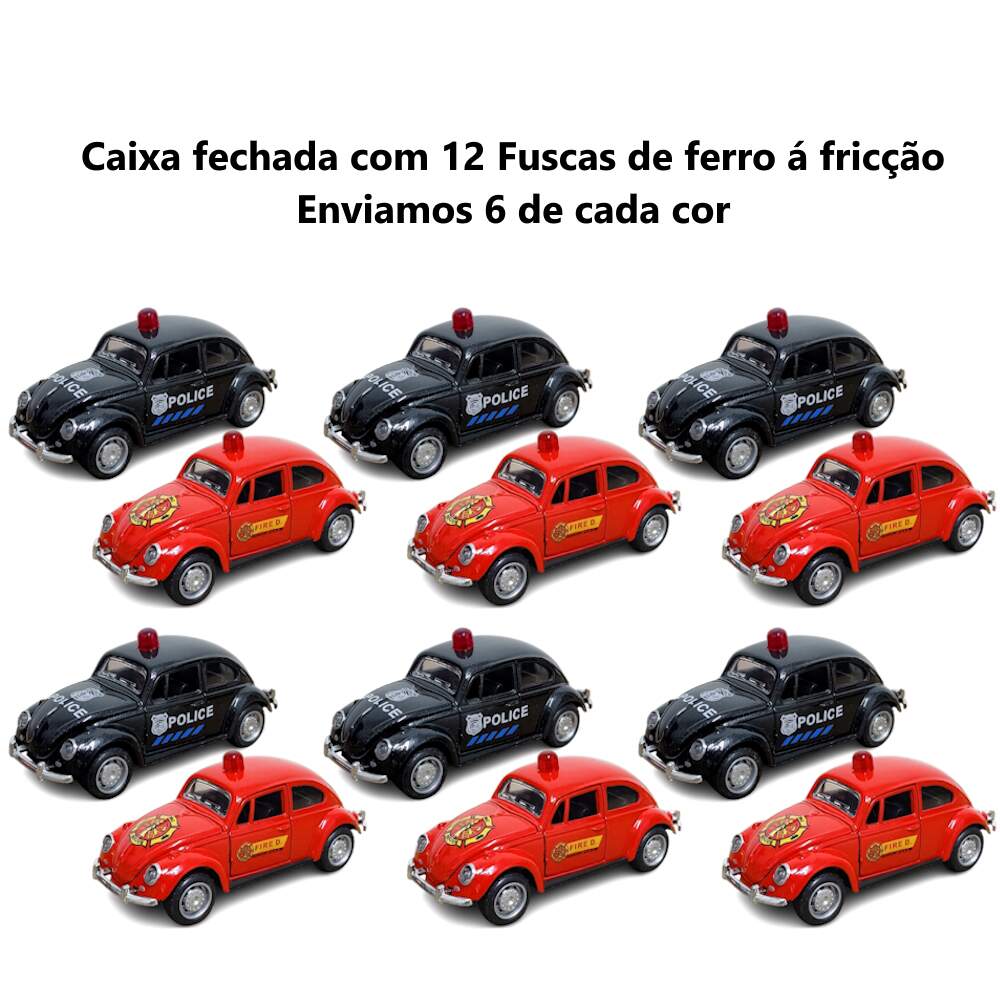 Caixa com 12 Carrinhos em Miniatura de Ferro Fusca Polícia e Bombeiro com Abertura de Portas e Pneus de Borracha com Caixa Display