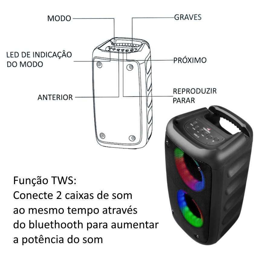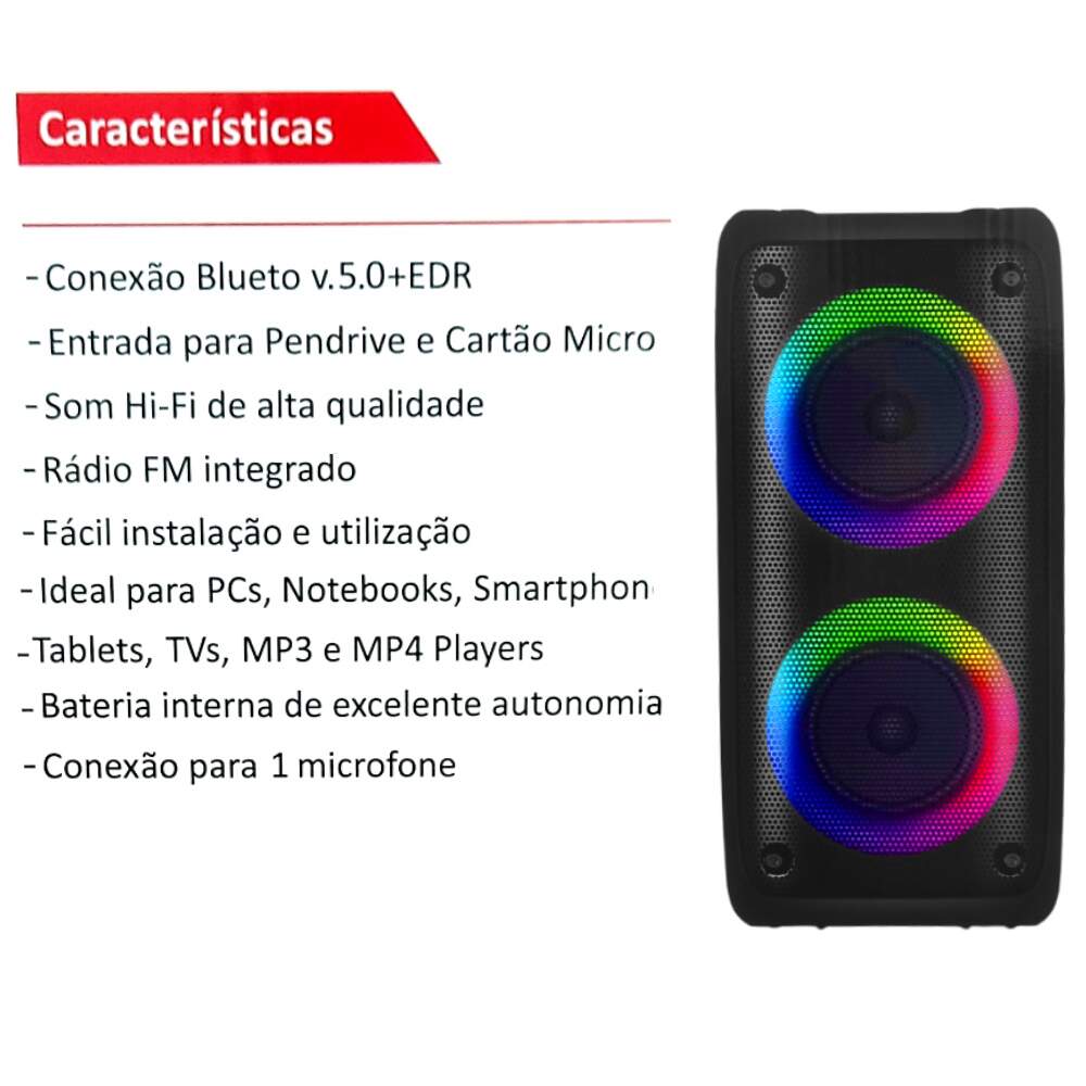Essa Caixa de Som com Microfone permite cantar enquanto toca uma música ou apenas o Ritmo Karaokê via Bluetooth, além de potente garante a diversão daquela galera que se reúne pela diversão e resenha!