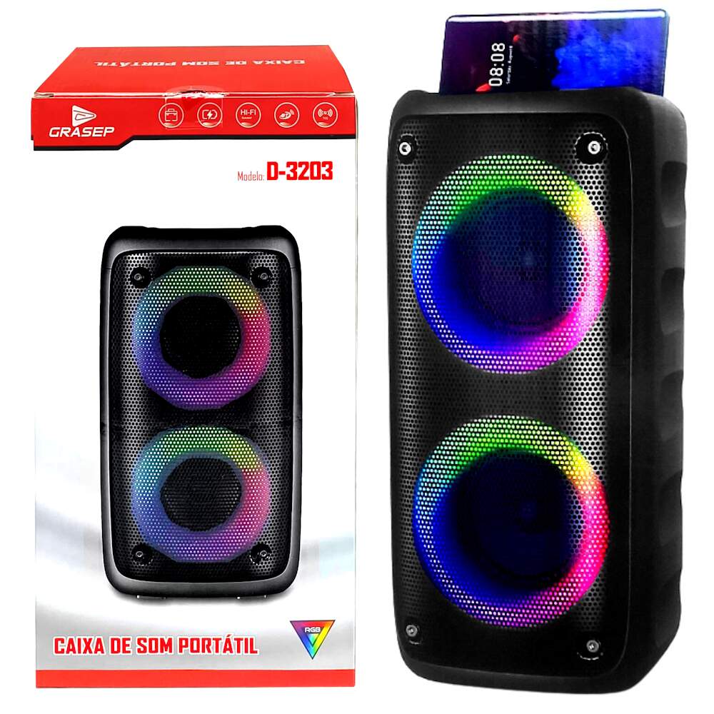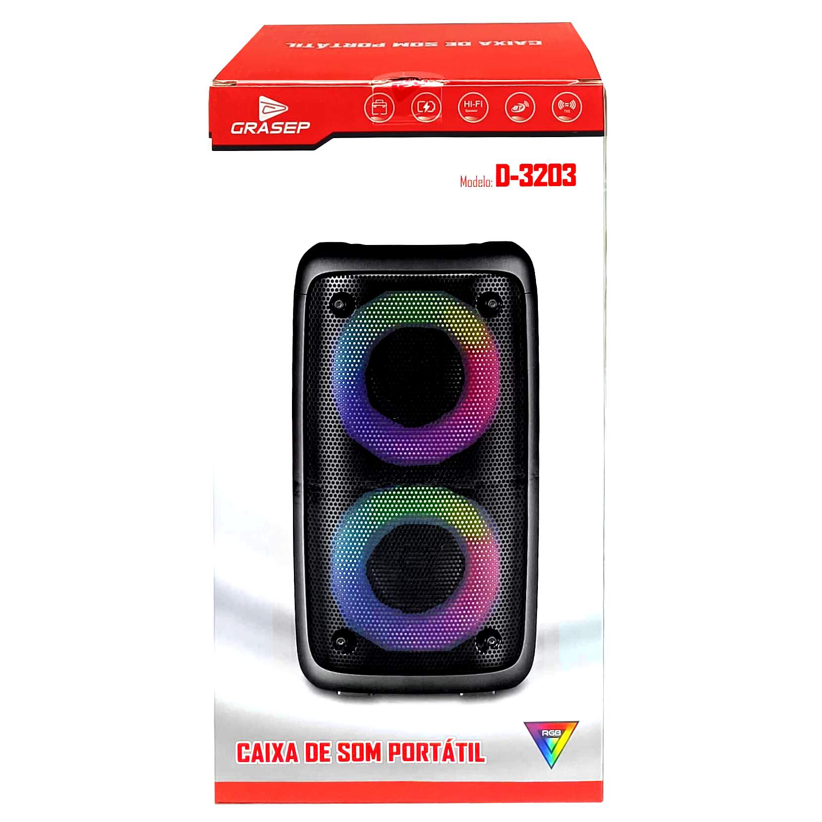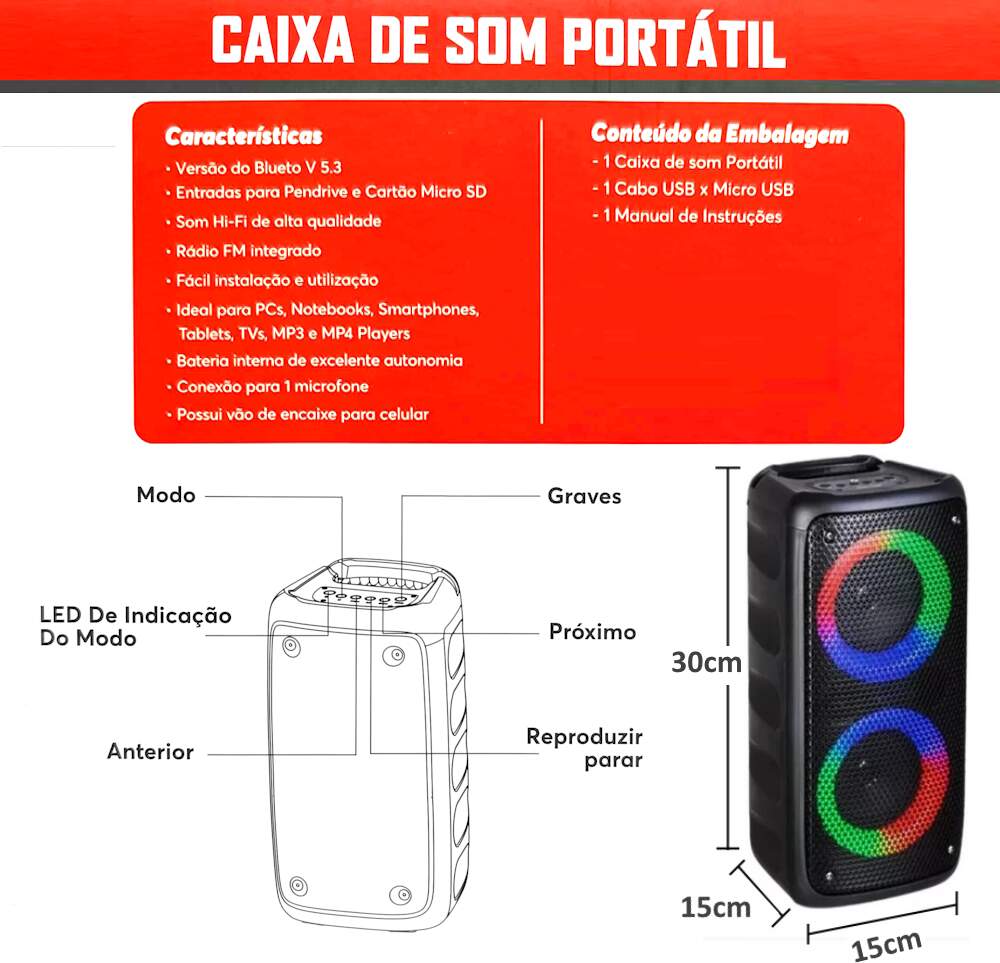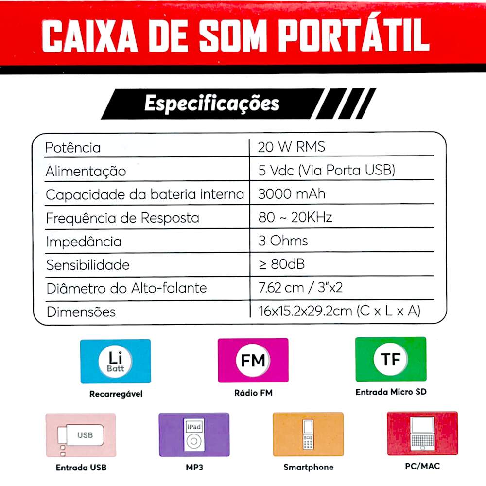 Caixinha de Som Torre 20W USB Bluetooth FM Cartão Super LEDs Caixinha de Som Torre 20W USB Bluetooth FM Cartão Super LEDs 0 avaliações | Dê a sua avaliação! Referência: D4232 Modelo/Marca: Caixa de Som Bluetooth Torre Portátil 20w com USB para Festa/Grasep Disponibilidade: Sem estoque R$ 151,57 ou 3x de R$ 52,86 sem juros ou em até 12x de R$ 16,14 no cartão Esse produto encontra-se indisponível. Deixe seu contato que avisaremos quando chegar. Seu nome: Seu e-mail: Desejo receber e-mails com lançamentos e promoções. Avise-me quando disponível Indicar este produto Deixar um comentário Caixa de Som Bluetooth Torre 20W Grasep 2 Alto Falantes Hi-Fi Super LEDs com FM com Suporte a Cartão, Pen Drive, TWS e MicrofoneA caixa de som Bluetooth Família Grasep possui som incrível, com um design compacto em forma de torre obtenha pressão sonora em um mini system de belo design. Com a transmissão via Bluetooth sem fio, facilidade para conexão e escutar suas músicas em movimento conectado com celular, tablete ou simplesmente ouvido sua rádio FM Favorita. Com o ótimo sistema de Bass transmita suas músicas favoritas em um som alto e nítido a qualquer momento, com um alto-falante Hi-fi de longo alcance, você vai incrementar ainda mais suas batidas e turbinar suas faixas favoritas. TWS - Conexão entre 2 CaixasEste modelo é equipado com o recurso TWS, que permite conectar duas caixinhas de som do mesmo modelo juntas através do bluetooth e dobrar sua potência sonora, um recurso muito legal!Luzes LEDMelhore o clima da festa com as luzes LED coloridas que alternam com efeitos de DJ, podem ser desligados ou ajustados para 3 Modos diferentes, monte a pista de dança e faça o seu próprio karaokê com uma entrada para microfone, liberte o artista que existe em você e transforma a sua festa em festão. Portátil e Recarregável:Além de tudo essa caixa conta com uma bateria Interna de alta capacidade, além de permitir o uso de uma bateria externa para estender mais sua diversão mesclando isso com a portabilidade de leva-la para onde desejar. Especificações- Potência: 20W RMS- Fabricante: GRASEP- Modelo: D-4232- Bateria: Bateria: Bateria: 3000 mAh Fornecendo até 6 horas de duração ou o mínimo de 1 hora e 30 minutos com o volume no máximo- Sensibilidade: = 80dB- Distorção: 0.3% 1W 1KHz- Interfaces de entrada: USB / SD / Aux / Bluetooth, P10 (Microfone)- Fonte de Alimentação: DC 5V, utilize qualquer porta USB ou carregador de celular- Rádio FM: Frequência 88 ~ 108MHz- Capacidade da Bateria: 3000 mAh- Iluminação: Led- Dimensões: Altura 36,5cm x Comprimento 15,1cm x Largura 16cm (aprox) Itens Inclusos:1x Caixa de Som Bluetooth Torre Grasep 1x Cabo Usb para Carregamento1x Manual