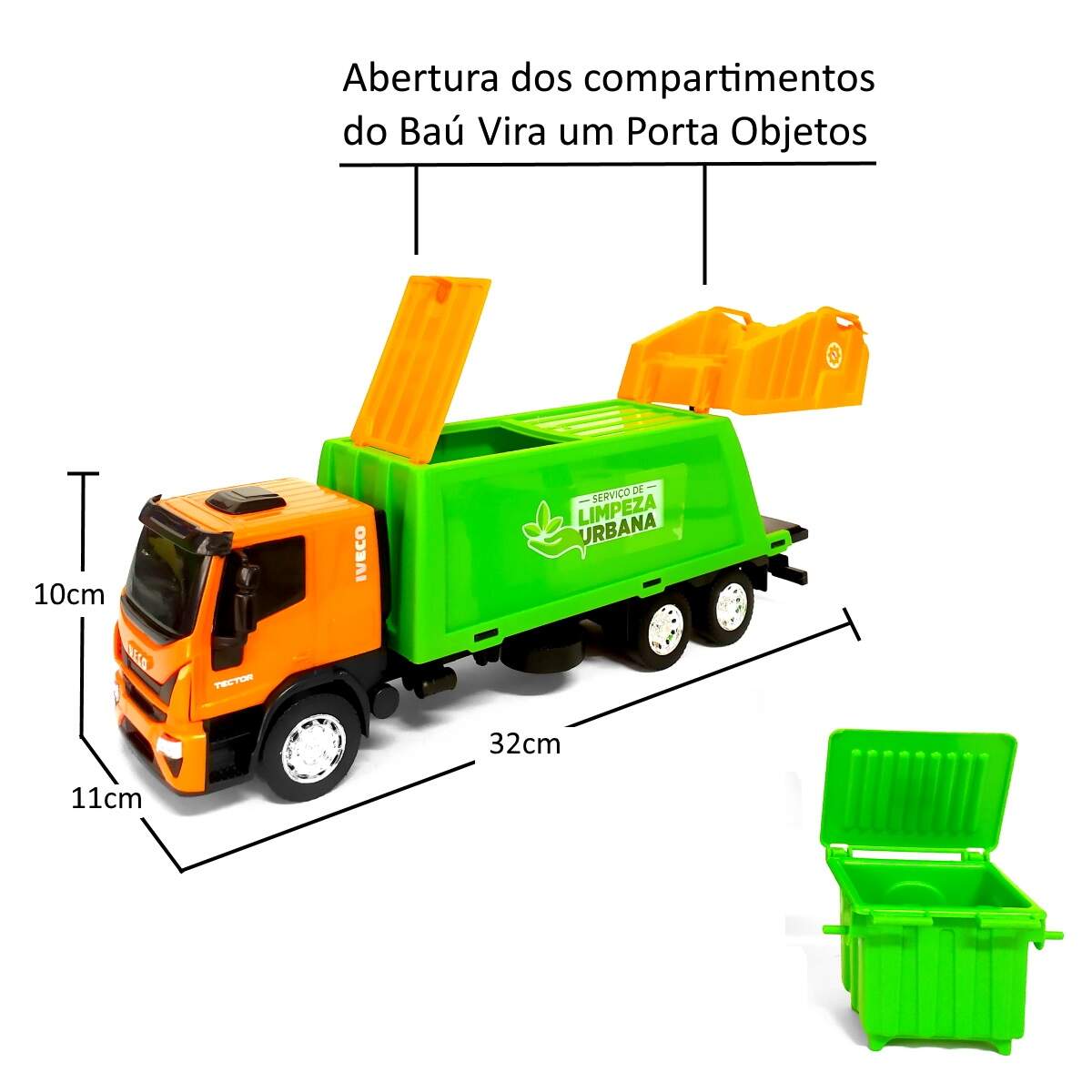 Caminhão de Lixo Coleta Seletiva e Reciclagem Usual Cores Sortidas Caminhão de Lixo Coleta Seletiva e Reciclagem Usual Cores Sortidas 0 avaliações | Dê a sua avaliação! Referência: 342-SORTIDO Modelo/Marca: Iveco Tector Coletor de Lixo/Usual Brinquedos R$ 59,62 ou 3x de R$ 20,79 sem juros ou em até 12x de R$ 6,35 no cartão Comprar Indicar este produto Deixar um comentário Boleto Bancário Parcelas 1x de R$ 62,37sem juros 2x de R$ 31,19sem juros 3x de R$ 20,79sem juros 4x de R$ 17,37 5x de R$ 14,26 6x de R$ 11,88 7x de R$ 10,40 8x de R$ 9,10 9x de R$ 8,30 10x de R$ 7,53 11x de R$ 6,84 12x de R$ 6,35 Brinquedo Caminhão de Lixo Iveco TectorAs crianças vão brincar muito com esse lindo caminhão de lixo modelo Iveco Tector, igualzinho aos caminhões que a gente vê nas ruas, cheio de detalhes e cores vivas. Os pequenos vão se divertir e montar vários cenários com esse Coletor de lixo. Ótimo para a interação das crianças, estimula a criatividade e o desenvolvimento infantil.Especificações:Fabricante: Usual BrinquedosReferência: 342Modelo: Iveco Tector Coletor de LixoCor: SortidoComposição: Polipropileno (PP)Indicado para crianças maiores de 3 anosDimensões: 32cm Comprimento x 10cm de Altura x 11 cm de LarguraCertificado INMETRO: Compulsório Registro 009922/2019Conteúdo do pacote:1 x Caminhão de Lixo1 x Caçamba de Lixo