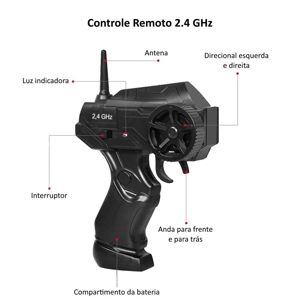 Alimentação Eletrônica: Carrinho - 1 bateria recarregável 3.7 V (inclusa), Controle - 2 pilhas "AA" 1.5 V (não inclusa)