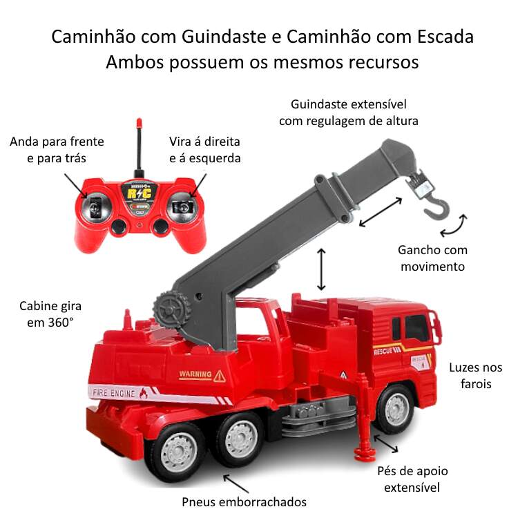 O caminhão de bombeiro de controle remoto mede cerca de 24 cm de comprimento, 8 de largura e 11 cm de altura. Com Controle Remoto completo: é multifuncional, anda para a frente, para trás, para a esquerda e para a direita, fabricando em material plástico anticolisão de alta qualidade e durável.