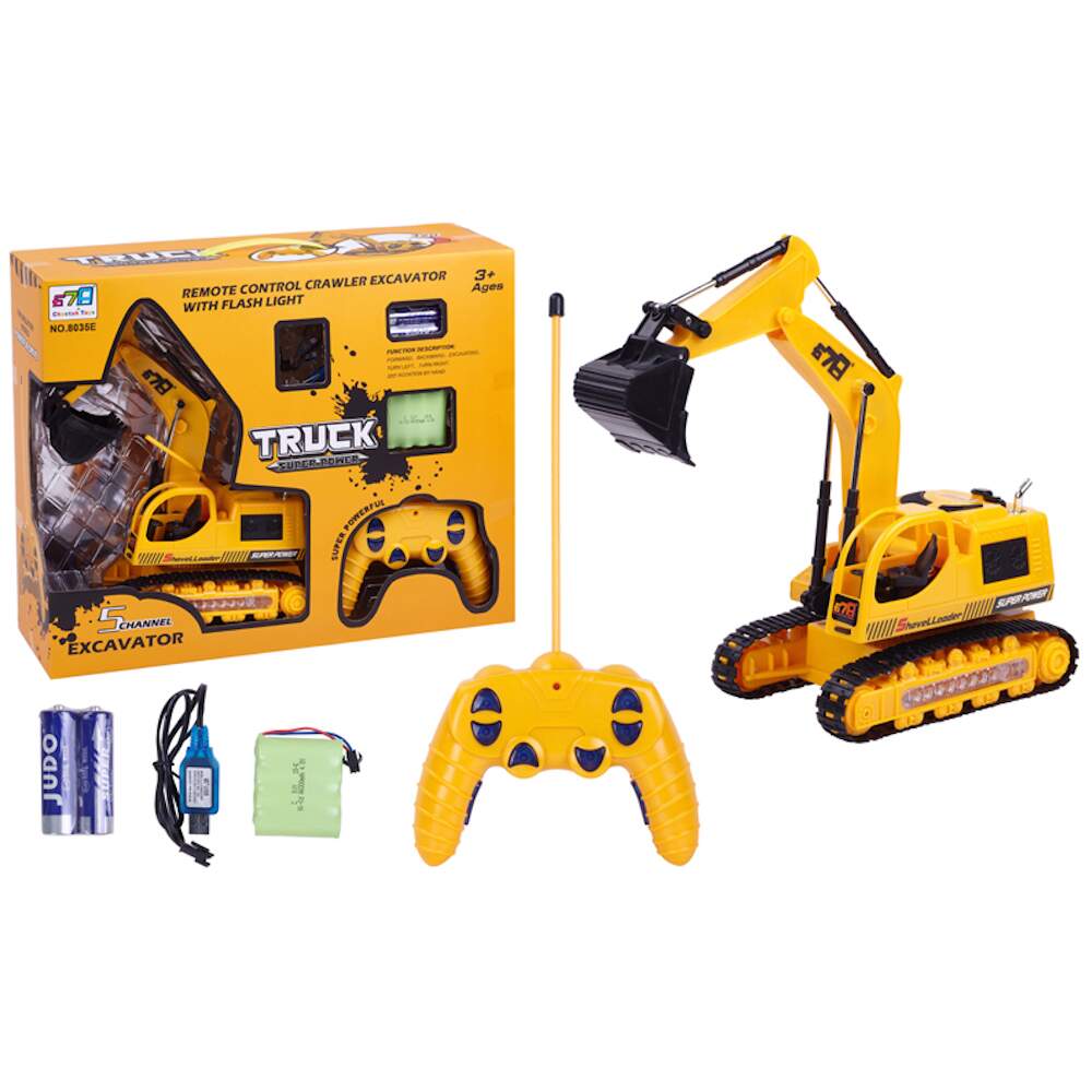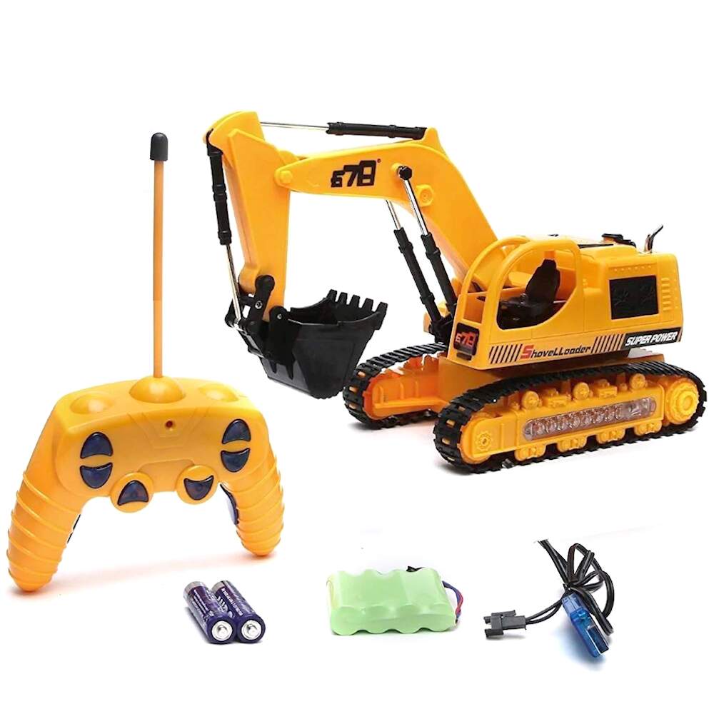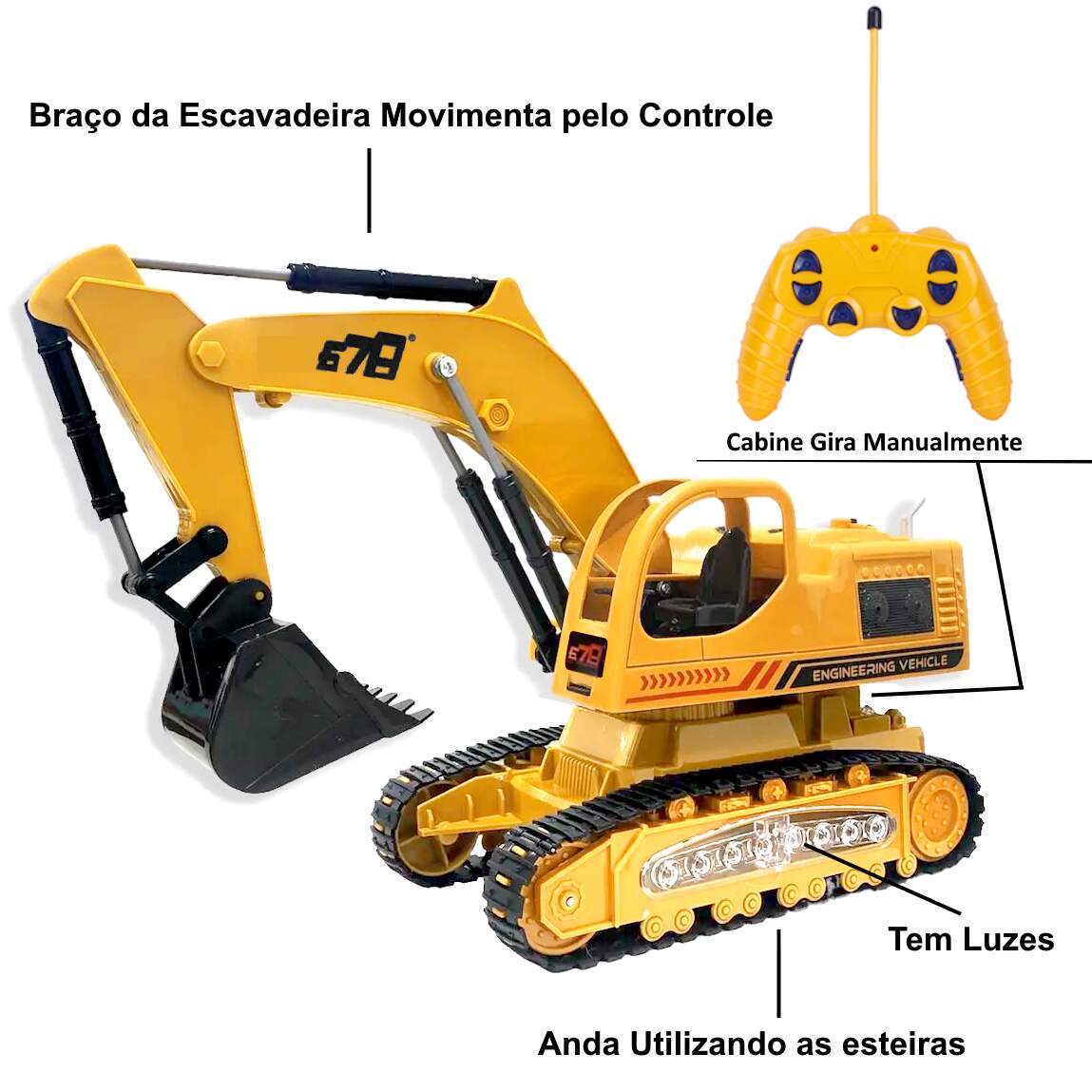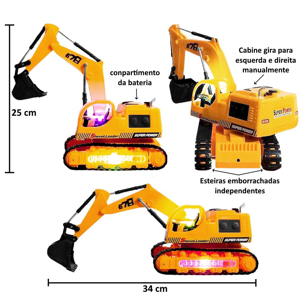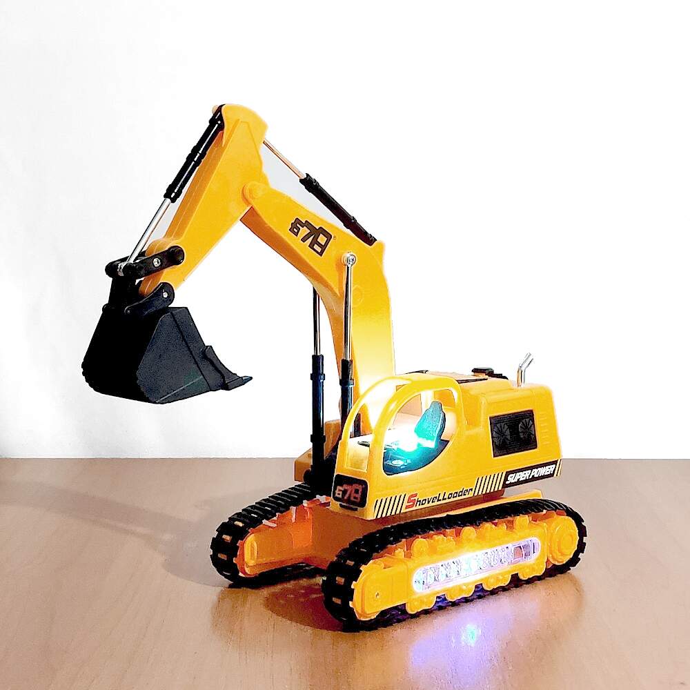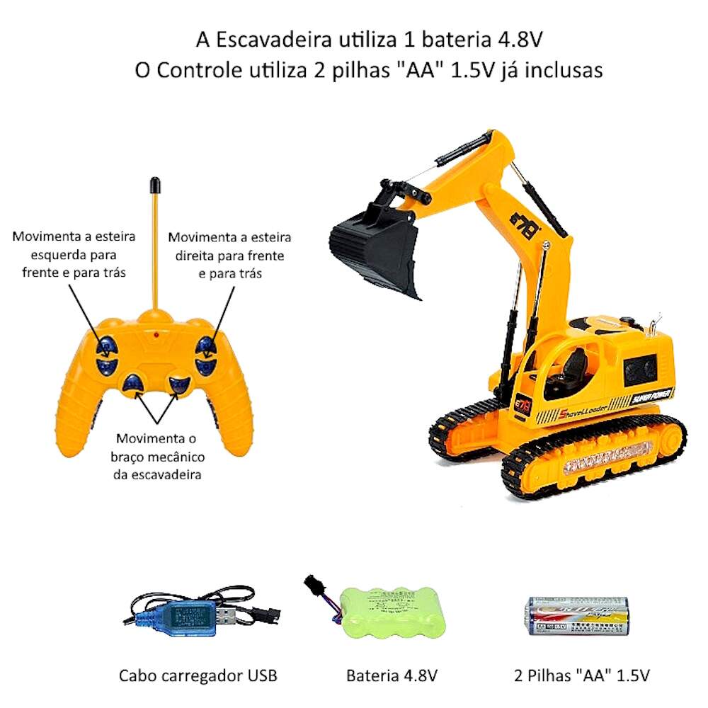 A Escavadeira de Controle Remoto conta com um belo design e controle fiel dos movimentos de uma máquina de verdade, equipada com um controle remoto de fácil utilização, com movimentos pelas esteiras tem as de ir para trás, para frente, virar para esquerda e direita Movimentar a Pá além de ter Luzes Som de Máquinas de Construção.