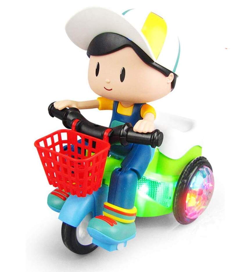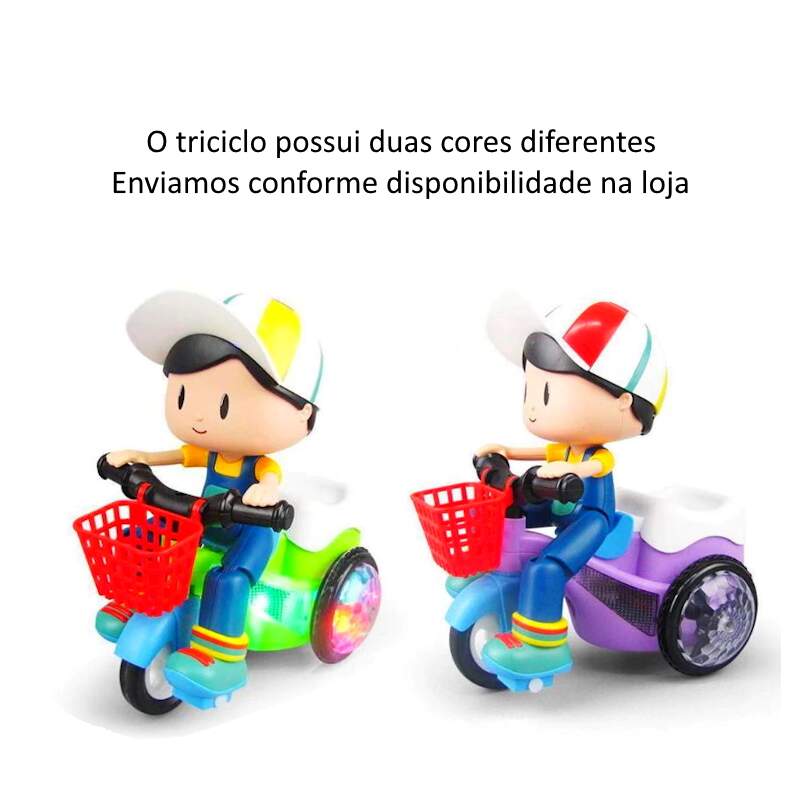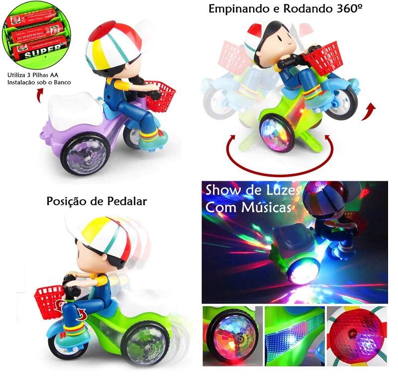 Brinquedo a Pilha Infantil Musical Menino no Triciclo que Empina Gira 360º Baby