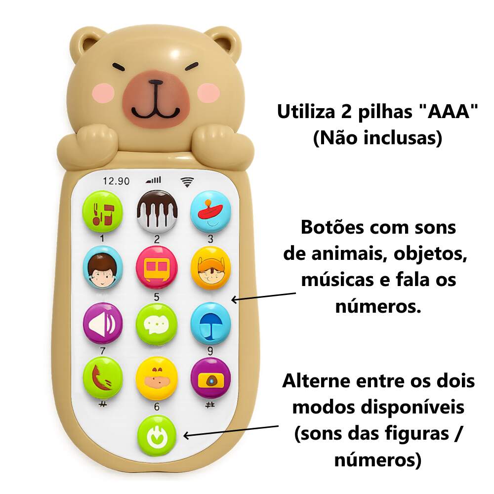 Celular Infantil Capivara Musical com Sons e Luzes Educativo 0 avaliações | Dê a sua avaliação! Referência: GK3380 Modelo/Marca: Celular Infantil Interativo Capivara Musical Com Luz E Som/Attic - Goal Kids R$ 19,39 ou 3x de R$ 6,76 sem juros ou em até 4x de R$ 5,65 no cartão Comprar Indicar este produto Deixar um comentário Boleto Bancário Parcelas 1x de R$ 20,29sem juros 2x de R$ 10,14sem juros 3x de R$ 6,76sem juros 4x de R$ 5,65 Telefone Celular Infantil Interativo Capivara Musical Com Luz E Som fala números Letras Animais com LuzO Celular Infantil Interativo Capivara Musical é um brinquedo divertido e educativo que encanta os pequenos com luzes, sons e muita interatividade. Inspirado na simpática capivara, o celular emite músicas e efeitos sonoros que estimulam os sentidos e o desenvolvimento cognitivo das crianças. Com design colorido, botões grandes e iluminação atrativa, é fácil de manusear e perfeito para brincadeiras de faz de conta. Ideal para crianças pequenas, ele ajuda no aprendizado, coordenação motora e proporciona momentos de alegria e imaginação.Vídeo de demonstração no anúncio ou em nossas redes e canais Flix Mobile / Flix M / @flixm.oficialCaracterísticas:Marca: Attic - Goal KidsModelo: Telefone Divertido MusicalIdade Recomendada: A partir de 12 mesesRecursos: Melodias, nome de números e sons diversosCertificado INMETRO: 011726/2024Conteúdo da Embalagem:1x Telefone Capivara