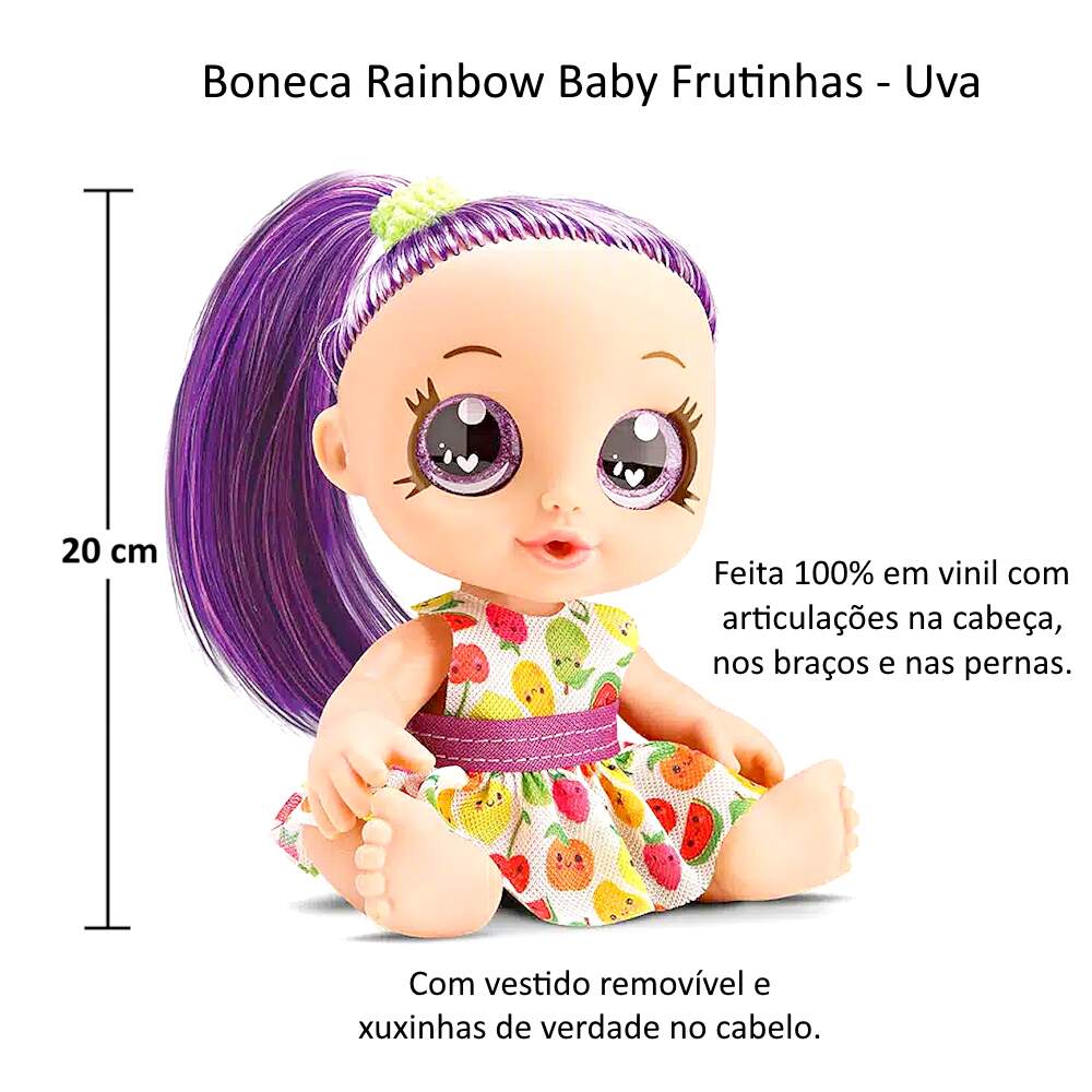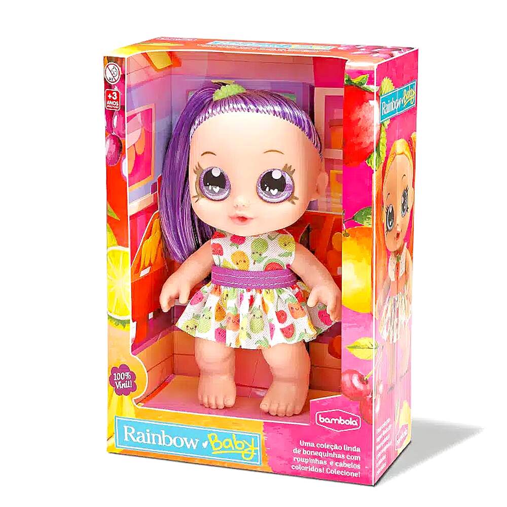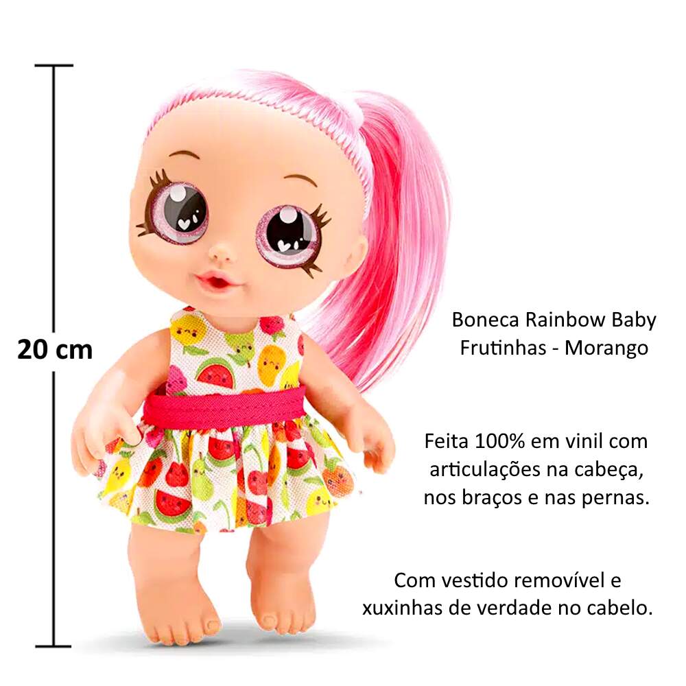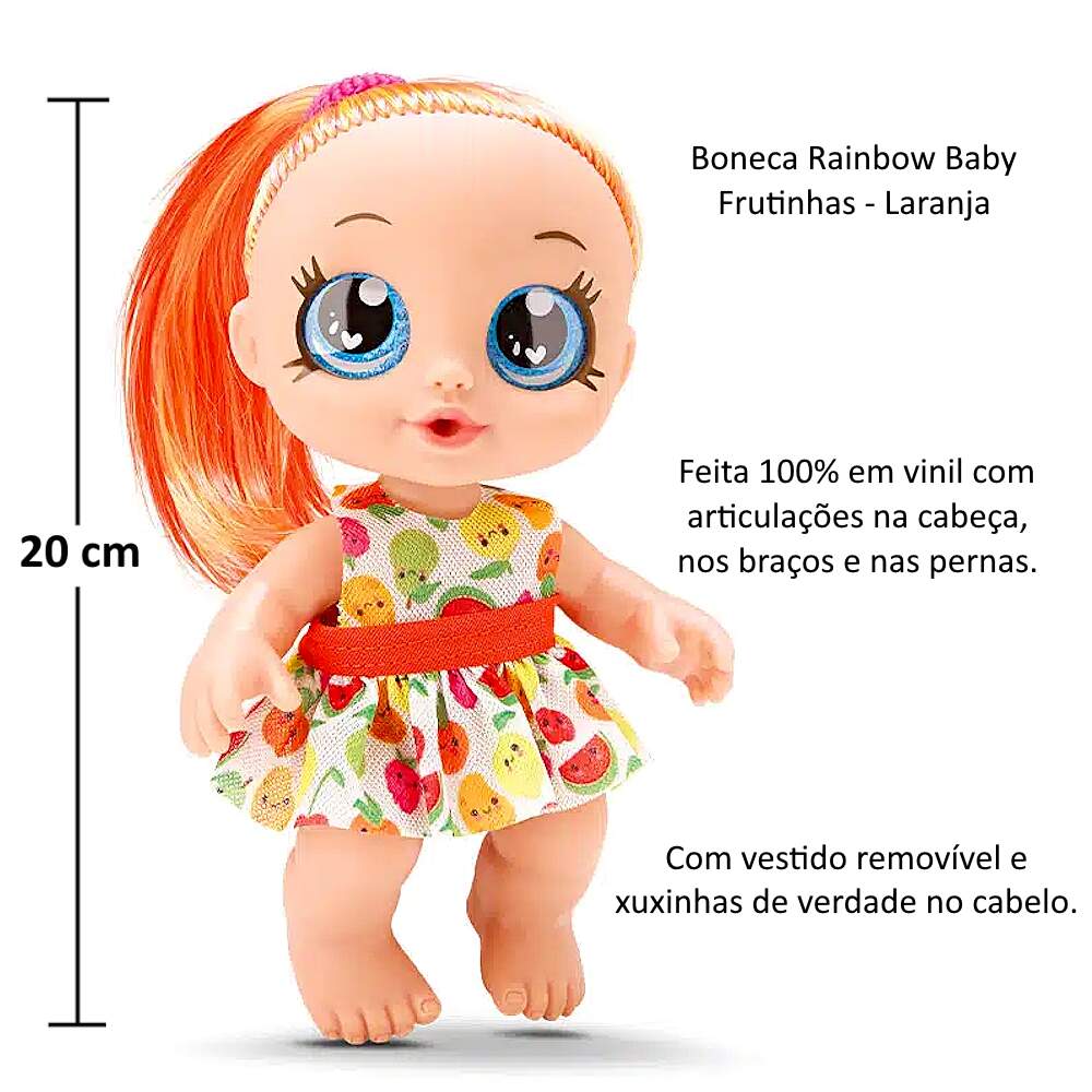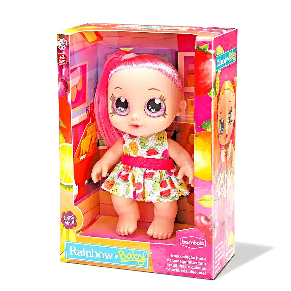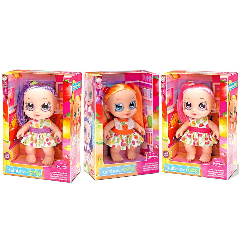Coleção 3 Bonecas Rainbow Frutinhas Laranja Uva e Morango na Caixa Original Coleção 3 Bonecas Rainbow Frutinhas Laranja Uva e Morango na Caixa Original 0 avaliações | Dê a sua avaliação! Referência: BAM871e872e873 Modelo/Marca: Boneca Bebê de Cabelo Colorido com Vestido e Xuxinha Rainbow Baby Frutinhas Morango Uva e Laranja/Bambola R$ 124,24 ou 3x de R$ 43,33 sem juros ou em até 12x de R$ 13,23 no cartão Comprar Indicar este produto Deixar um comentário Boleto Bancário Parcelas 1x de R$ 129,98sem juros 2x de R$ 64,99sem juros 3x de R$ 43,33sem juros 4x de R$ 36,19 5x de R$ 29,72 6x de R$ 24,77 7x de R$ 21,67 8x de R$ 18,97 9x de R$ 17,29 10x de R$ 15,68 11x de R$ 14,26 12x de R$ 13,23 Boneca Bebê de Cabelo Colorido com Vestido e Xuxinha Rainbow Baby Frutinhas Morango Uva e LaranjaAs bonecas Rainbow Baby Frutinhas da Bambola são brinquedos fofos e divertidos para crianças de todas as idades. São feitas de materiais de alta qualidade, seguras e cheias de detalhes para brincar ou decorar o quarto da criança. Possuem 20 cm de altura, cabelos coloridos, vestidos removíveis, xuxinhas de verdade no cabelo e são fabricadas em 100% vinil, que dá maciez e uma textura agradável ao brinquedo. Fazem parte de uma coleção de bonecas super fofinhas, cada uma com um tema diferente, para você amar e cuidar com muito carinho!Característica:Marca: BambolaModelo: Rainbow Baby Frutinhas Referência: 871, 872 e 873Tamanho (aprox.): 14 x 8 x 20 cm (C x L x A)Idade Recomendada: A partir de 3 anosMaterial: 100% VinilAs bonecas não tem cheiro de fruta, proibido por possíveis reações a criançaCertificado INMETRO: Compulsório 009289/2022Conteúdo da Embalagem:1x Boneca Rainbow Baby Frutinhas Morango1x Boneca Rainbow Baby Frutinhas Uva1x Boneca Rainbow Baby Frutinhas Laranja