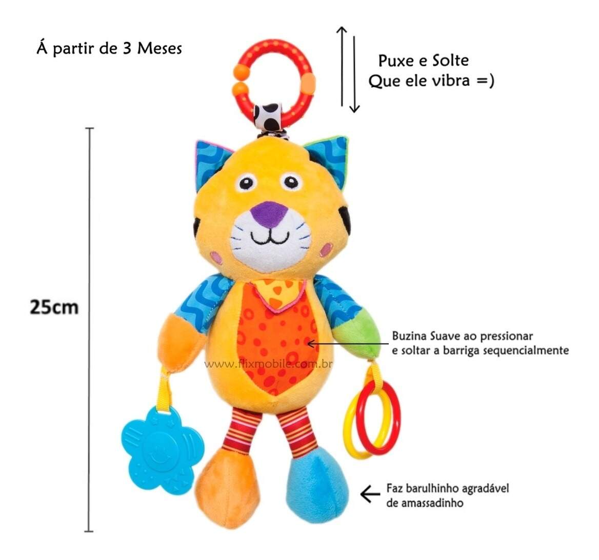Gatinho de Atividades Treme Treme Com Chocalho e Mordedor - Buba Gatinho de Atividades Treme Treme Com Chocalho e Mordedor - Buba 0 avaliações | Dê a sua avaliação! Referência: 5911 Modelo/Marca: Pelúcia de Atividades/Buba R$ 94,38 ou 3x de R$ 32,91 sem juros ou em até 12x de R$ 10,05 no cartão Comprar Indicar este produto Deixar um comentário Boleto Bancário Parcelas 1x de R$ 98,74sem juros 2x de R$ 49,37sem juros 3x de R$ 32,91sem juros 4x de R$ 27,49 5x de R$ 22,57 6x de R$ 18,81 7x de R$ 16,46 8x de R$ 14,41 9x de R$ 13,13 10x de R$ 11,91 11x de R$ 10,83 12x de R$ 10,05 Pelúcia de Atividades Gatinho da BubaPelúcia de Atividades Buba. Brinquedo completo e multiuso, auxilia e ajuda no desenvolvimento do bebê. Com mordedores, chocalhos e alça para pendura-lo no berço ou carrinho. A Pelúcia conta com:- Argolas- Mordedores- Buzina- Chocalhos- Som de amassadinho- Puxe a corda e ele treme Especificações:Marca: BubaIdade: recomendado para crianças acima de 3 mesesDimensões: aproximadamente 23 x 14 x 30 cm - (Alt-Comp-Larg)Peso: 138gCERTIFICADO INMETRO: CE-BRI/INNAC-00110-03AItens inclusos: 1 Pelúcia de Atividades Itens Inclusos:1 x Pelúcia de Gatinho da Buba