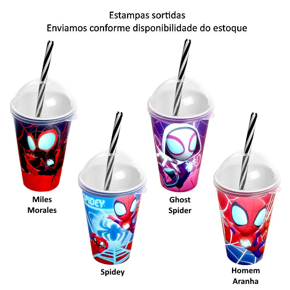 Copo de alta qualidade da Plasútil Spidey 280ml com Tampa e Canudo Livre de BPA Estampa Sortida para Festa Infantil Aniversário Doces Decoração Estampas Variadas