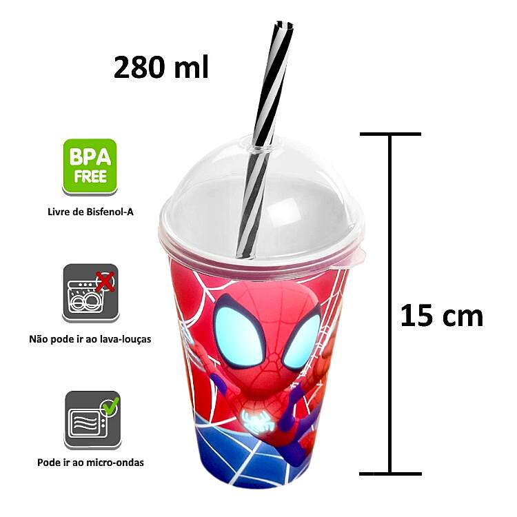 Copo de alta qualidade da Plasútil Spidey 280ml com Tampa e Canudo Livre de BPA Estampa Sortida para Festa Infantil Aniversário, Doces Decoração Estampas Variadas