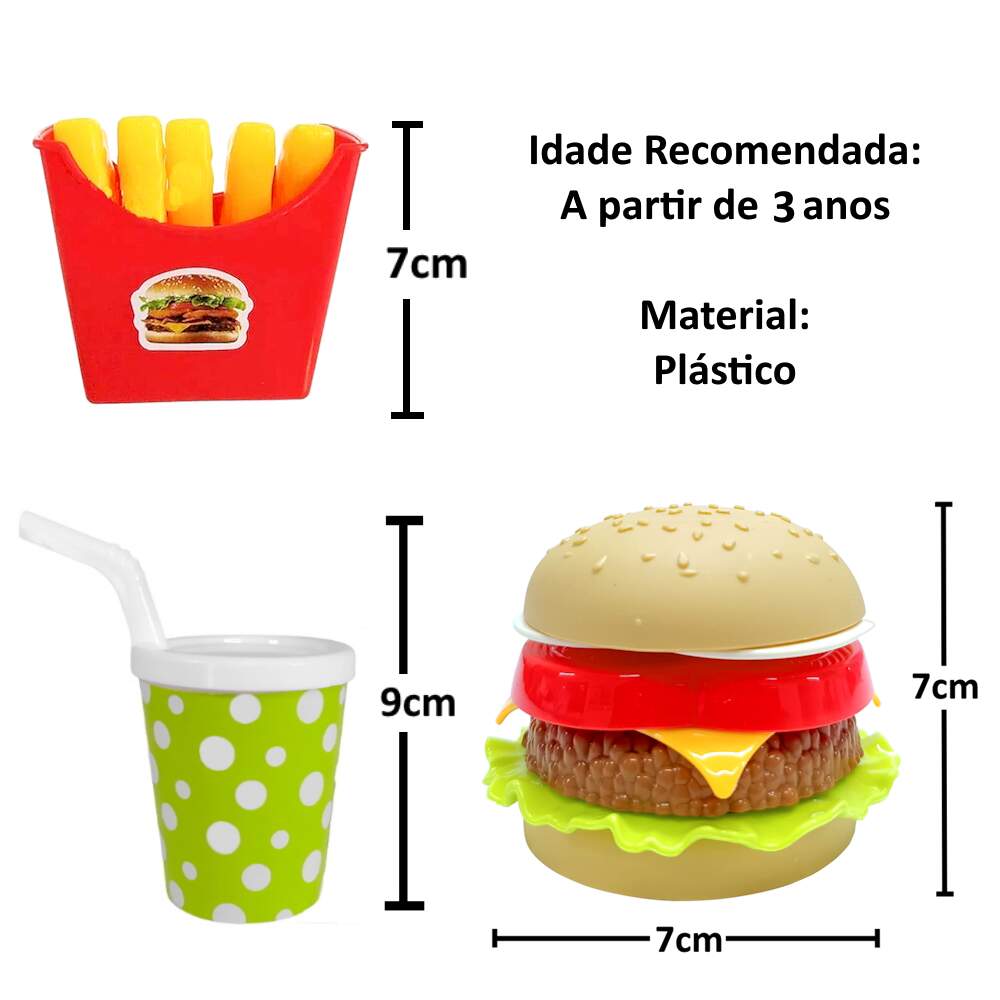 O Kit Hambúrguer de brinquedo traz muito realismo para as brincadeiras de casinha e comidinha, o lanche tem detalhes realistas e todos os ingredientes são encaixados podendo ser desmontados e a clássica batatinha é solta na caixinha trazendo mais legitimidade para a brincadeira e refrigerante para o Kit MC Ficar completo!