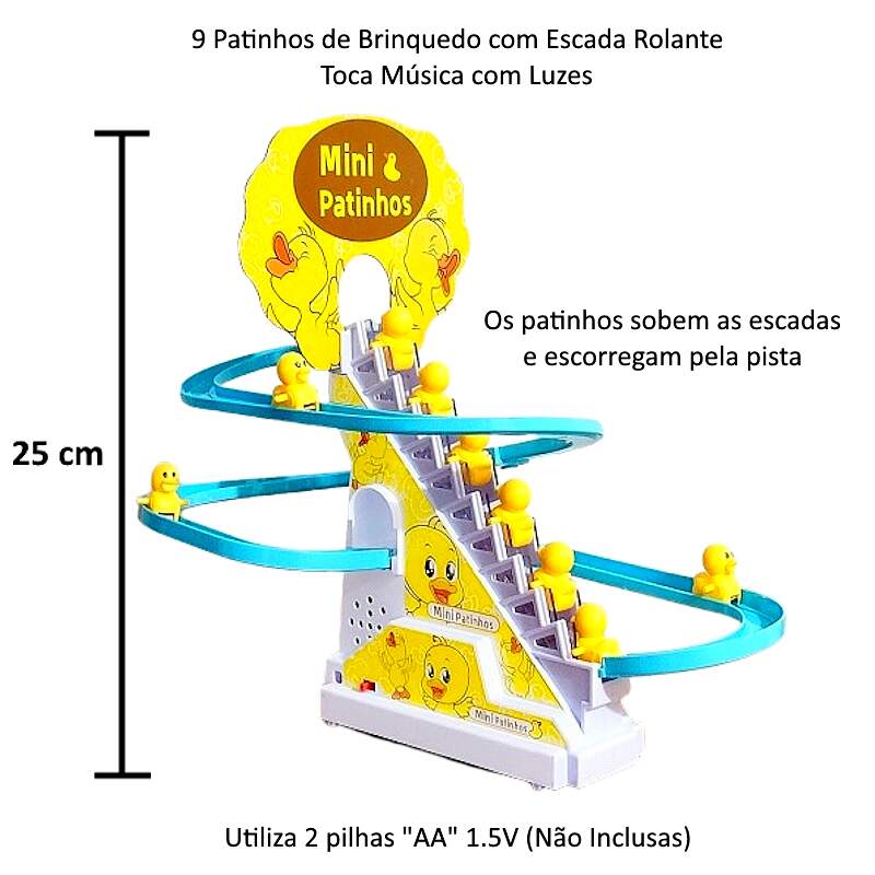 Pista Musical Escorregador de Patinhos Divertido Brinquedo Pista Musical Escorregador de Patinhos Divertido Brinquedo 0 avaliações | Dê a sua avaliação! Referência: TKAB6325 Modelo/Marca: Brinquedo Musical Infantil Mini Patinhos Sobe Escada Rolante e Escorrega com Som e Luz/Toy King R$ 49,39 ou 3x de R$ 17,22 sem juros ou em até 10x de R$ 6,23 no cartão Comprar Indicar este produto Deixar um comentário Boleto Bancário Parcelas 1x de R$ 51,67sem juros 2x de R$ 25,84sem juros 3x de R$ 17,22sem juros 4x de R$ 14,39 5x de R$ 11,81 6x de R$ 9,85 7x de R$ 8,62 8x de R$ 7,54 9x de R$ 6,87 10x de R$ 6,23 Brinquedo Musical Infantil Mini Patinhos Sobe Escada Rolante e Escorrega com Som e LuzOs patinhos adoráveis ??sobem a escada rolante enfileirados e escorregam pelo escorregador com entusiasmo. As luzes piscantes e as melodias animadas criam um ambiente festivo que prende a atenção das crianças. É feito com materiais de qualidade garantindo segurança e diversão para as crianças.Características:Marca: Toy KingReferência: TK-AB6325Idade Recomendada: A partir de 3 anosTamanho: 27 x 15 x 25 cm (C X L X A)Certificado INMETRO: 004947/2021Conteúdo da Embalagem:1x Brinquedo Musical Escada Rolante com Escorregador9x Mini Patinhos