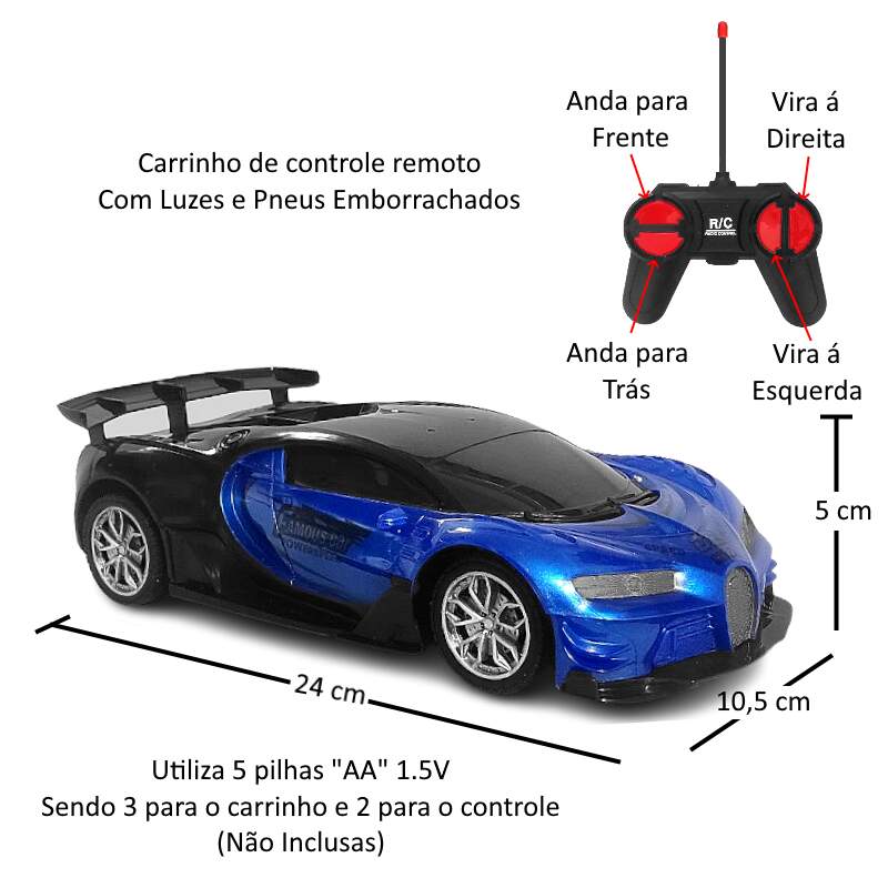 Super Carro de Controle Remoto Infantil Bugatti Azul Super Carro de Controle Remoto Infantil Bugatti Azul 0 avaliações | Dê a sua avaliação! Referência: TKAB4471azul Modelo/Marca: Carrinho de Controle Remoto com Luzes/Toy King R$ 63,87 ou 3x de R$ 22,27 sem juros ou em até 12x de R$ 6,80 no cartão Comprar Indicar este produto Deixar um comentário Boleto Bancário Parcelas 1x de R$ 66,82sem juros 2x de R$ 33,41sem juros 3x de R$ 22,27sem juros 4x de R$ 18,60 5x de R$ 15,28 6x de R$ 12,73 7x de R$ 11,14 8x de R$ 9,75 9x de R$ 8,89 10x de R$ 8,06 11x de R$ 7,33 12x de R$ 6,80 Carrinho de Controle Remoto Bugatti com LuzesO Carrinho de Controle Remoto com Luzes é o brinquedo perfeito para crianças de todas as idades. Possui um design realista cheio de detalhes e pneus emborrachados. Além disso, ele é feito de materiais de alta qualidade, o que garante sua durabilidade e resistência ao desgaste. Se você está procurando um brinquedo que vai proporcionar horas de diversão, o Carrinho de Controle Remoto é a escolha perfeita.Características:Modelo: Carrinho de Controle Remoto com LuzesReferência: TK-AB4471Tamanho: 24 x 10,5 x 5 cm (CxLxA)Idade Recomendada: A partir de 3 anosAlimentação Eletrônica: ¨5 pilhas "AA", sendo 2 para o controle e 3 para o carrinho (Não Inclusas)Certificado INMETRO: CE-BRI/INNAC - 02316-03A NM 300/2002Controle Remoto - Certificado Anatel: 008596-22-06024Conteúdo do Pacote:1x Carrinho Azul1x Controle Remoto1x Manual de Instruções