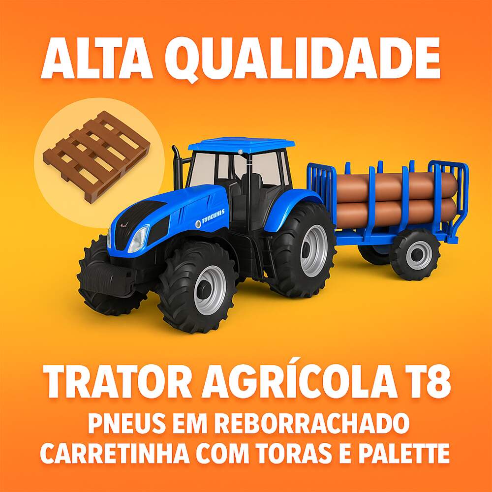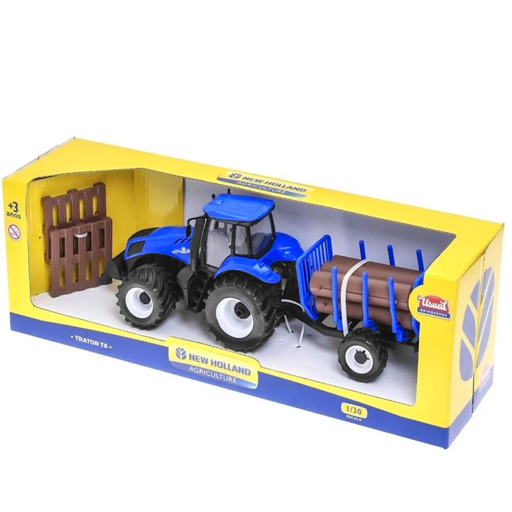 Trator de Agricultura New Holland de Tora Azul na Caixa 0 avaliações | Dê a sua avaliação! Referência: 588 Modelo/Marca: Trator Agrícola De Brinquedo Azul New Holland Agriculture T8 Miniatura com Acessórios Toras e Palets/Usual R$ 95,16 ou 3x de R$ 33,19 sem juros ou em até 12x de R$ 10,13 no cartão Comprar Indicar este produto Deixar um comentário Boleto Bancário Parcelas 1x de R$ 99,56sem juros 2x de R$ 49,78sem juros 3x de R$ 33,19sem juros 4x de R$ 27,72 5x de R$ 22,76 6x de R$ 18,97 7x de R$ 16,60 8x de R$ 14,53 9x de R$ 13,24 10x de R$ 12,01 11x de R$ 10,92 12x de R$ 10,13 Trator FR Tora Azul Miniatura Realista De Brinquedo Com Reboque Carretinha New Holland T8Este trator Tora azul em miniatura é um brinquedo robusto e encantador, perfeito para a diversão das crianças. Fabricado com materiais duráveis, ele apresenta um design realista com detalhes que imitam os tratores de verdade. Acompanhando o trator, há um reboque Carretinha que pode ser facilmente engatado, adicionando mais possibilidades de brincadeiras. As rodas grandes e resistentes permitem que o trator e a Carretinha se desloquem por diferentes superfícies, seja dentro de casa ou em áreas externas. Sua cor azul vibrante e o acabamento cuidadoso fazem dele um item atraente para colecionadores mirins e um excelente presente para estimular a imaginação e o desenvolvimento motor das crianças.Vídeo de demonstração no anúncio ou em nossas redes e canais Flix Mobile / Flix M / @flixm.oficialEspecificações:Fabricante: Usual BrinquedosReferência: 588Cor: SortidoModelo: New Holland Agriculture TorasComposição: Polipropileno (PP)Dimensões: 35cm de comprimento x 14cm de altura x 11cm de LarguraIndicado para crianças maiores de 3 anos Conteúdo do pacote:1 x Trator 5 x Toras1 x Carretinha2 x Paletes