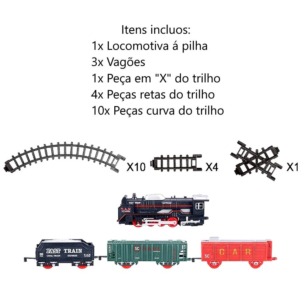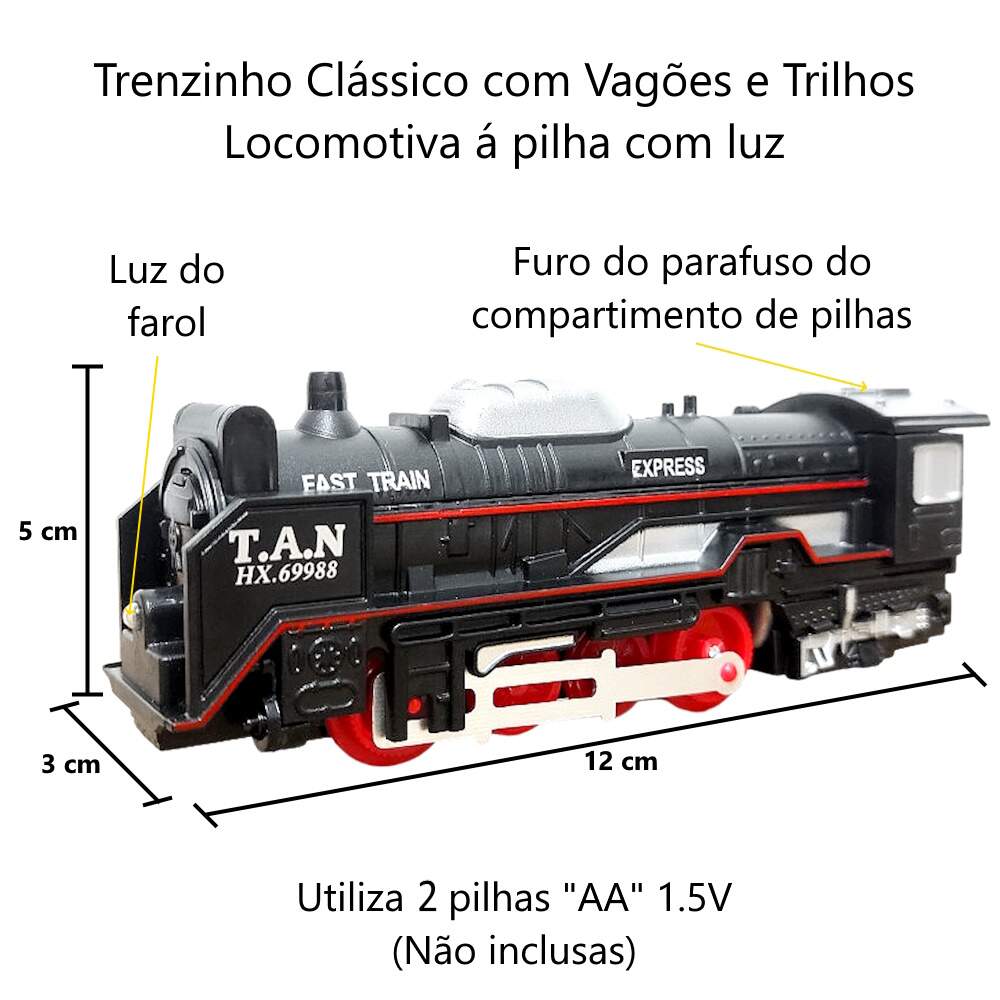 Trenzinho Clássico Ferroviário de Brinquedo Locomotiva com 3 Vagões de Carga 15 Trilhos com Luz