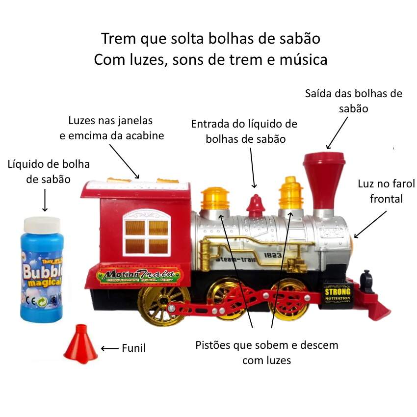 Trem Musical Bate e Volta que solta Bolhas de Sabão Infantil Trem Musical Bate e Volta que solta Bolhas de Sabão Infantil 0 avaliações | Dê a sua avaliação! Referência: CP015935 Modelo/Marca: Trem Solta Bolhas de Sabão com Som e Luzes/Fun Game Disponibilidade: Sem estoque R$ 113,67 ou 3x de R$ 39,64 sem juros ou em até 12x de R$ 12,10 no cartão Esse produto encontra-se indisponível. Deixe seu contato que avisaremos quando chegar. Seu nome: Seu e-mail: Desejo receber e-mails com lançamentos e promoções. Avise-me quando disponível Indicar este produto Deixar um comentário Trem de Brinquedo que Solta Bolhas de Sabão com Som e LuzesAs crianças vão se divertir com esse trenzinho de brinquedo. Ele solta bolinhas de sabão pela chaminé, para isto basta colocar o líquido que o acompanha no compartimento e pronto, é só ligar. Toca música, tem luzes e faz sons de trem. Possui um sistema de movimento bate e volta para que nunca fique parado.Características:Referência: CP015935Tamanho: 16 cm de Altura x 9,5 de Largura x 28 cm de ComprimentoIdade Recomendada: A partir de 3 anosComposição (material): PlásticoAlimentação Eletrônica: Utiliza 3 pilhas "AA" 1.5v (não inclusas)Certificado INMETRO: Compulsório Registro 001820/2021Funções: Solta bolhas de sabão, Luzes, Música, Sons, Bate e VoltaItens Inclusos:1x Trem de Brinquedo1x Frasco com líquido de bolhas de sabão1x Funil