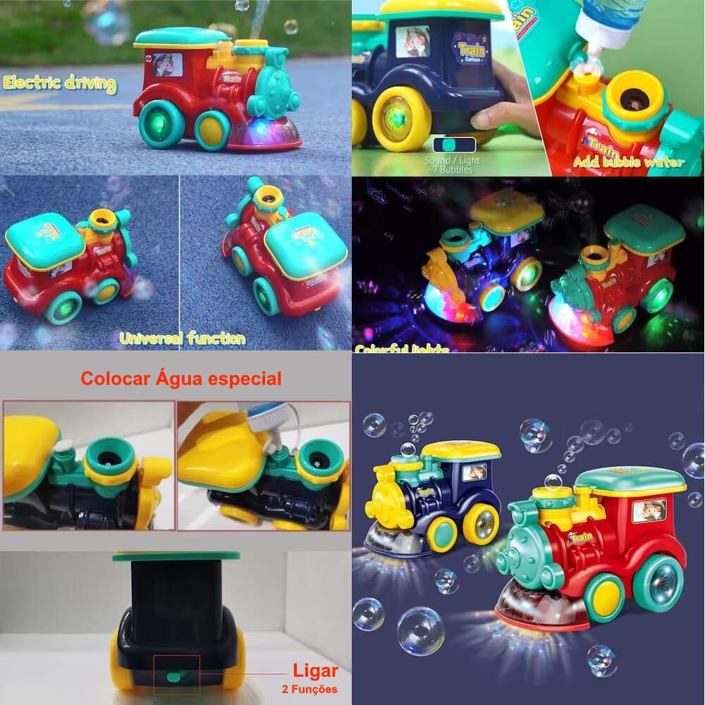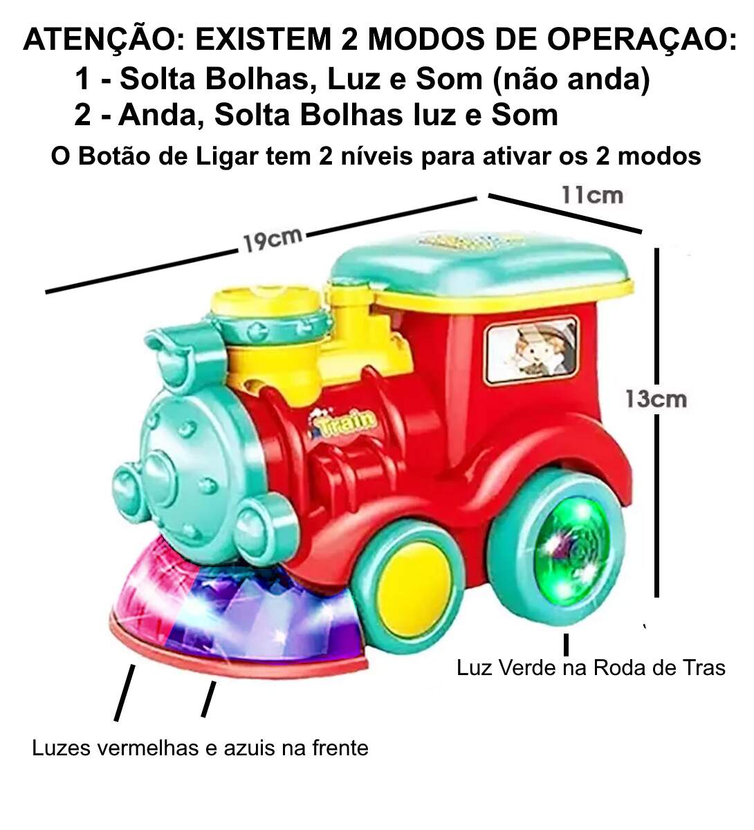 Trem Musical Bate e Volta solta Bolhas de Sabão + Refil 1L Trem Musical Bate e Volta solta Bolhas de Sabão + Refil 1L 0 avaliações | Dê a sua avaliação! Referência: CP143028eGA810001 Modelo/Marca: Trem Solta Bolhas de Sabão com Som e Luzes + Refil 1L/Barcelona R$ 79,50 ou 3x de R$ 27,72 sem juros ou em até 12x de R$ 8,46 no cartão Comprar Indicar este produto Deixar um comentário Boleto Bancário Parcelas 1x de R$ 83,17sem juros 2x de R$ 41,59sem juros 3x de R$ 27,72sem juros 4x de R$ 23,16 5x de R$ 19,01 6x de R$ 15,85 7x de R$ 13,87 8x de R$ 12,14 9x de R$ 11,06 10x de R$ 10,03 11x de R$ 9,12 12x de R$ 8,46 Trem de Brinquedo que Solta Bolhas de Sabão com Som e LuzesAs crianças vão se divertir com esse trenzinho de brinquedo. Ele solta bolinhas de sabão pela chaminé, para isto basta colocar o líquido que o acompanha no compartimento e pronto, é só ligar. Toca música, tem luzes e faz sons de trem. Possui um sistema de movimento bate e volta para que nunca fique parado.Características:Referência: CP015935Tamanho: 16 cm de Altura x 9,5 de Largura x 28 cm de ComprimentoIdade Recomendada: A partir de 3 anosComposição (material): PlásticoAlimentação Eletrônica: Utiliza 3 pilhas "AA" 1.5v (não inclusas)Certificado INMETRO: Compulsório Registro 001820/2021Funções: Solta bolhas de sabão, Luzes, Música, Sons, Bate e VoltaItens Inclusos:1x Trem de Brinquedo1x Frasco com líquido de bolhas de sabão1x Funil1x Um Litro de Liquido Especial para Bolhas